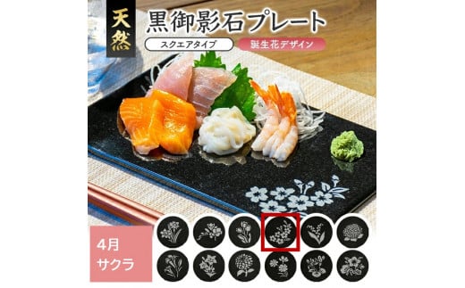 天然黒御影石 スクエアプレート 1枚 【誕生花彫刻(4月サクラ)】 SE0259