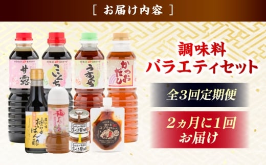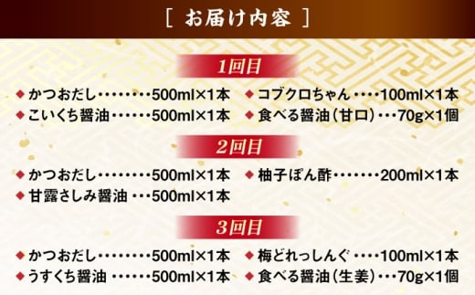 - 【ふるさと納税限定】【全3回定期便】基本からアレンジまで調味料バラエティセット 調味料 だし かつおだし 醤油 しょうゆ こいくち みりん ギフト 詰め合わせ お歳暮 島根県雲南市/有限会社紅梅しょうゆ [AICV039]