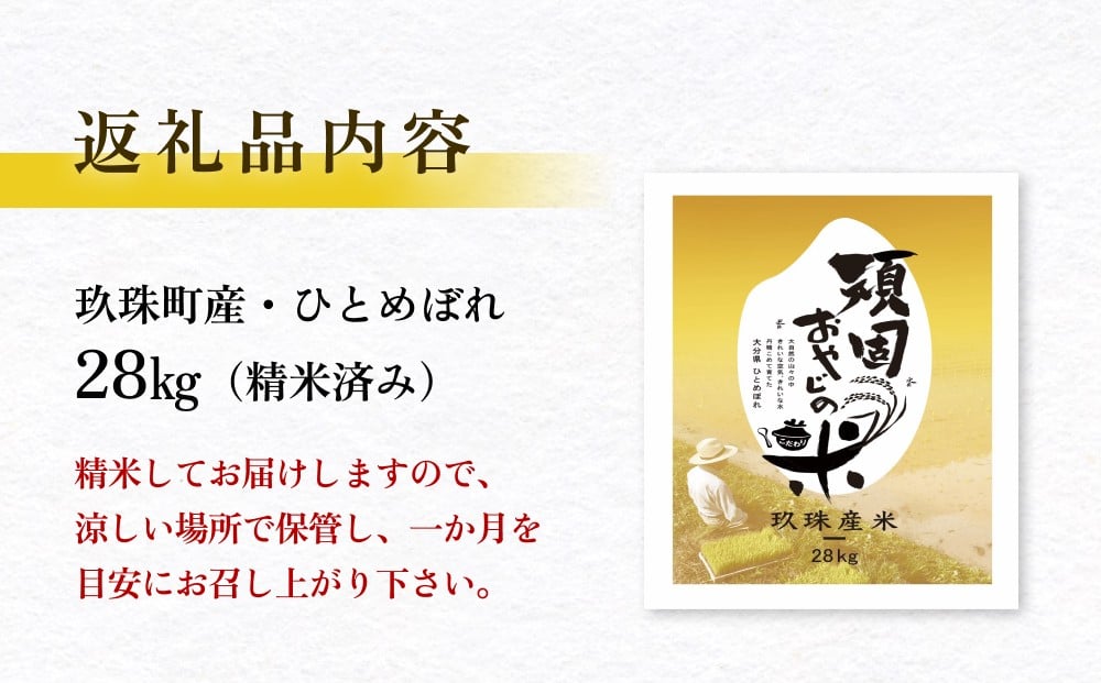 【令和7年 新米 大分県玖珠産・お米・ひとめぼれ 28㎏(30㎏を精米すると28㎏になります)】頑固おやじのこだわり米(精米済み・減農薬) 大分県産 米 令和7年産 頒布会 米 単一米 限定 国産 お米 即納 精米 コメ こめ 新米