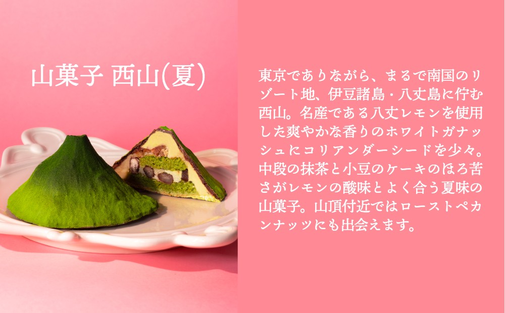 山菓子 西山(夏) 【チョコレート菓子 スイーツ ガナッシュ ケーキ 小豆 果実 ナッツ クレープ生地 ビスケット 八丈レモン コリアンダーシード ローストピーカンナッツ ダークチョコレート 抹茶チョコレート】