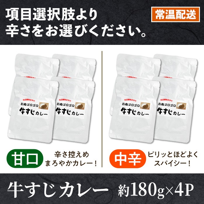 i1113 <辛さが選べる!>牛すじカレー(180g×4P・計720g) 牛すじ カレー 甘口 中辛 国産 牛 肉 レトルト 常温 保存 4食 4人前 簡単 調理 レンジ 湯煎 ごはん おかず 【まつぼっくり】