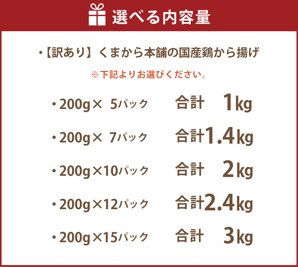 - 【ふるさと納税】【選べる容量】 【訳あり】 くまから本舗の国産鶏から揚げ 200g×5P 計1kg / 200g×7P 計1.4kg / 200g×10P 計2kg / 200g×12P 計2.4kg / 200g×15P 計3kg 唐揚げ 鶏肉 ムネ肉 熊本県 あさぎり町 送料無料