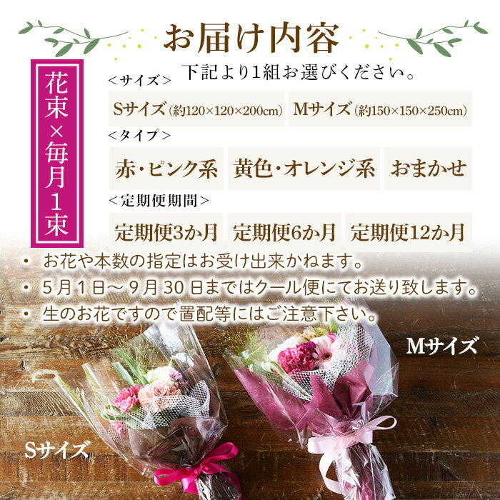 - 【ふるさと納税】<選べるサイズ・タイプ・定期便期間>花束(Sサイズ/Mサイズ・赤ピンク系/黄色オレンジ系/おまかせ・3ヶ月/6ヶ月/12ヶ月・毎月1束) 花束 ブーケ フラワーギフト 季節の花 生花 お祝い 誕生日 記念日 プレゼント ギフト 贈り物 【m56-05】【Porte-Bonheur】