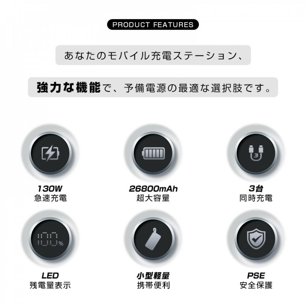 - 【ふるさと納税】【2025年最新作】 モバイルバッテリー 26800mAh/99.16Wh 大容量 USB-A出力 Type-C出力/入力 ケーブル不要 3台同時充電 PD 100W急速充電 ノートPC 互換性抜群 LED残電量表示 iPhone16 15 安全保護機能搭載 防災グッズ PSE認証済【PL保険加入済み製品・安心】