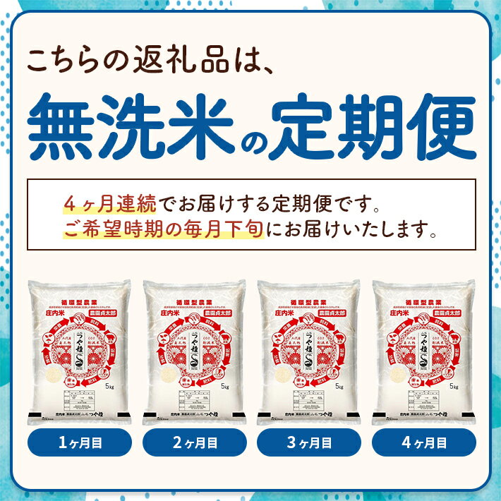 - 【ふるさと納税】≪4ヶ月定期便≫ 無洗米 特別栽培米 つや姫 5kg×4ヶ月連続 計20kg 令和7年産 山形県産 ご希望期間の毎月下旬にお届け 白米 庄内米 米 ごはん ご飯 酒田市 庄内 山形県 東北 定期便 4回
