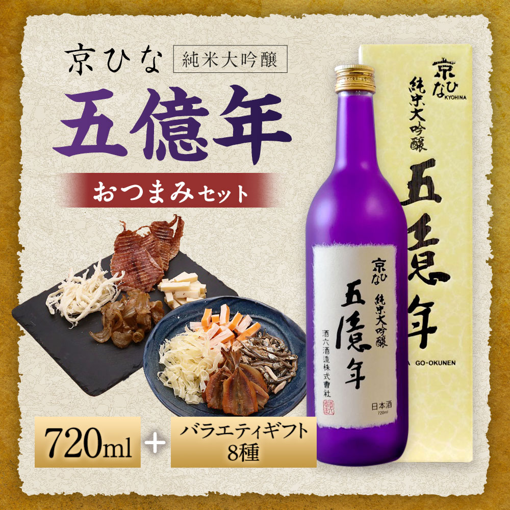 - 【ふるさと納税】京ひな 五億年純米大吟醸 720ml×1本 おつまみセット(バラエティギフト8点セット) アーモンド小魚 するめ 小いわし 焼きあじ さきいか レッドチェダー 花チーズプレーン トリュフチーズ 酒 【えひめの町(超)推し!(砥部町)】 愛媛県 送料無料 (599)