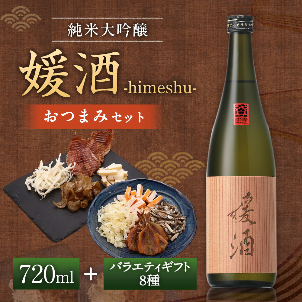 - 【ふるさと納税】媛酒-himeshu-純米大吟醸 720ml×1本 おつまみセット(バラエティギフト8点セット) アーモンド小魚 するめ 小いわし 焼きあじ さきいか レッドチェダー 花チーズプレーン トリュフチーズ 酒 【えひめの町(超)推し!(砥部町)】 愛媛県 送料無料 (598)