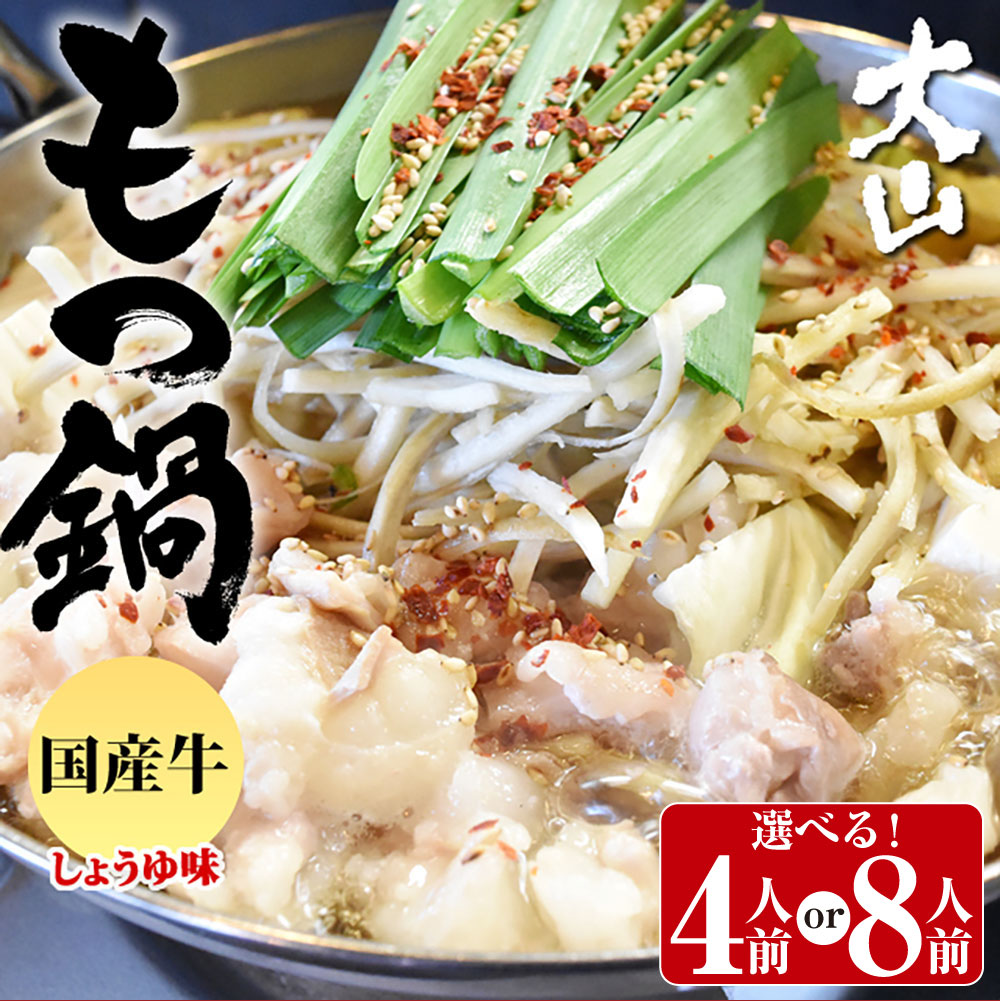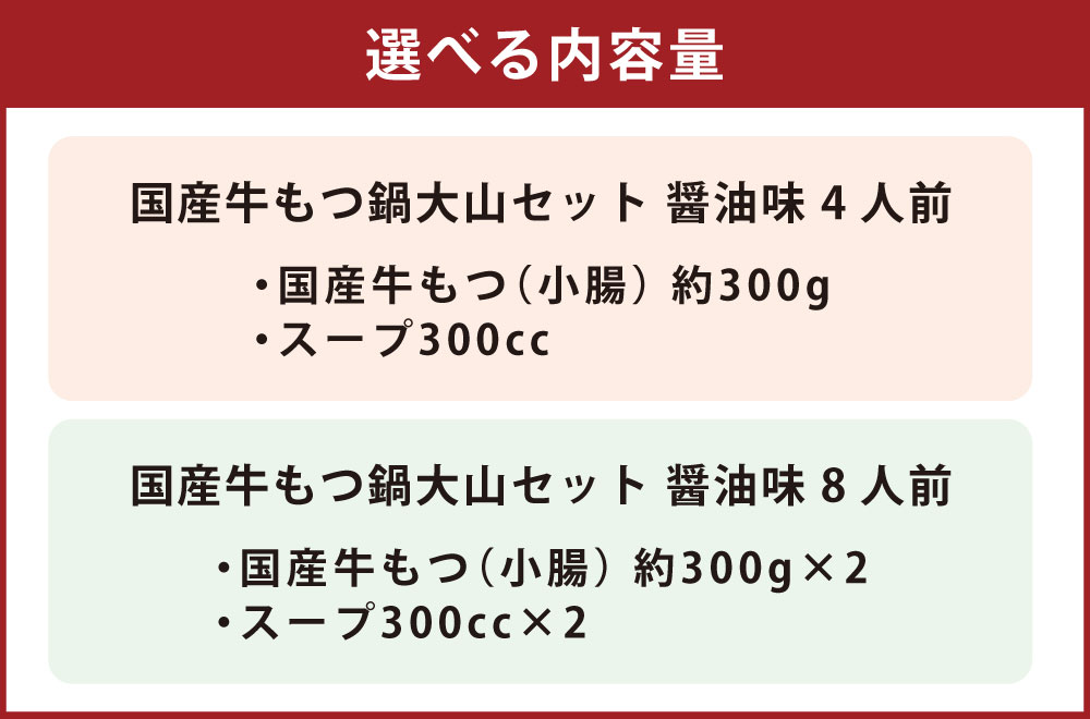 - 【ふるさと納税】<選べる内容量>国産牛もつ鍋大山セット 醤油味 4人前 約300g / 8人前 計約600g(約300g×2) もつ鍋 モツ鍋 ミックスホルモン 小腸 大腸 ギアラ 牛肉 お肉 スープ しょうゆ 惣菜 鍋料理 コラーゲン 冷凍 国産 熊本県 熊本市 送料無料