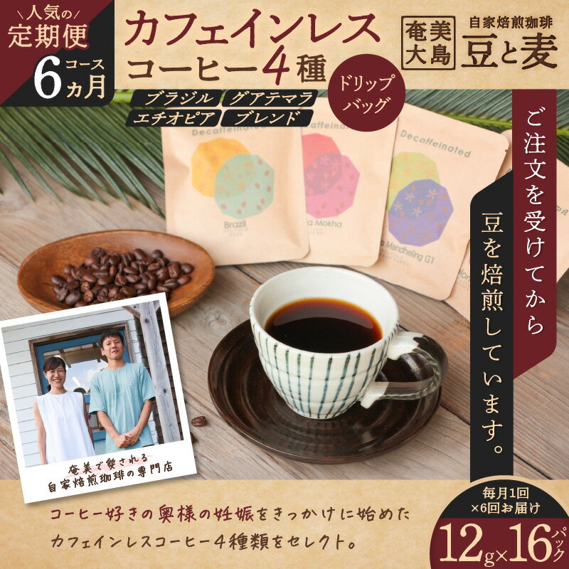 - 【ふるさと納税】<人気の定期便 6ヶ月 コース>ドリップバッグ カフェインレス コーヒー 4種 珈琲 飲み比べ 詰め合わせ ブラジル グアテマラ エチオピア ブレンド デカフェ 鮮度 自家焙煎珈琲 豆と麦 鹿児島 奄美市 おすすめ ランキング プレゼント ギフト