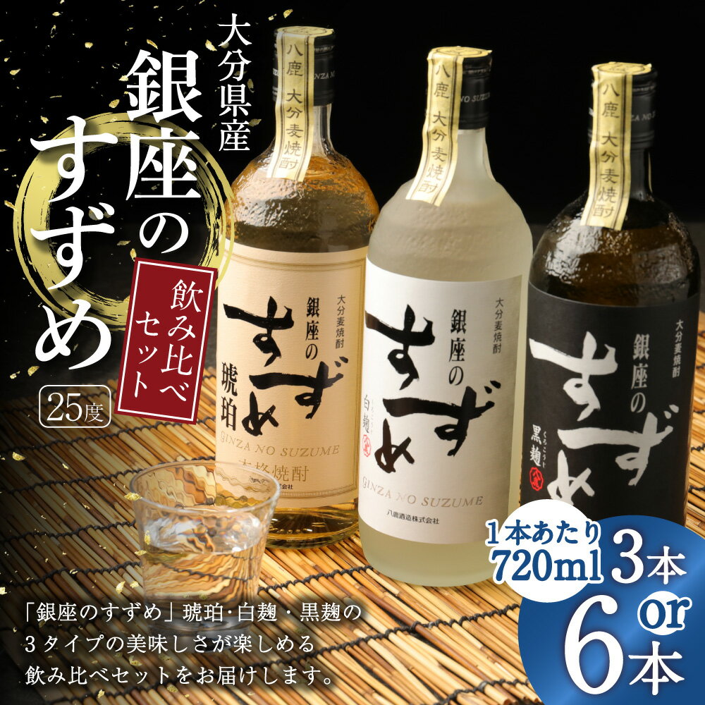 - 【ふるさと納税】【選べる容量】25度 銀座のすずめ 飲み比べ 3本/6本 セット (琥珀・白麹・黒麹) 合計2.16L/4.32L 1本あたり720ml 3種 焼酎 麦焼酎 麦 麦麹 お酒 アルコール 瓶 国産 九州産 大分県産 送料無料