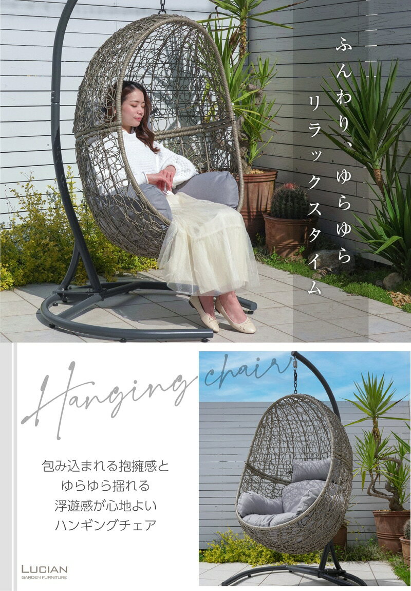 【ふるさと納税】ハンギングチェア エッグ型 クッション付き / コスティック 卵型 吊り下げ ラタン 屋外 自立式 1人掛け 室内 ファブリック生地 アウトレット ベランピング グレージュ 奈良県 御所市