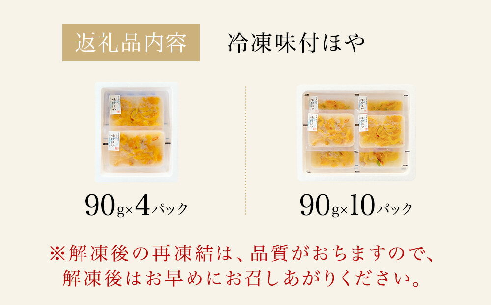 - 【ふるさと納税】<内容量が選べる> みやぎの 冷凍 味付ほや セット 360g-900g( 90g × 4P or 10P ) 海鞘 ほや ホヤ 味付き しそ風味 石巻市 小分け 食べきりサイズ 珍味 酒の肴 おつまみ 酒に合う 刺身 海鮮 魚介 宮城県 石巻 宮城 14日以内