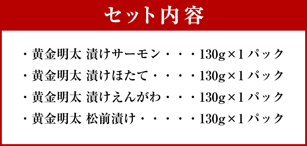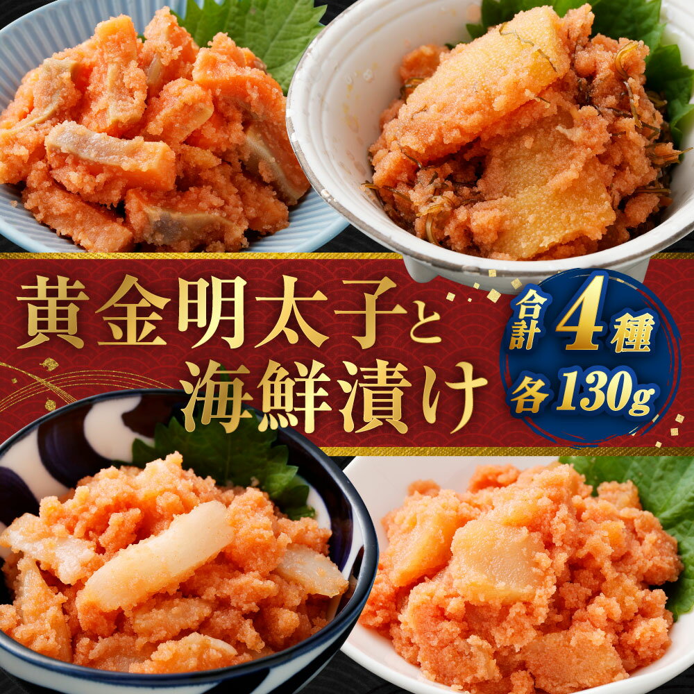 - 【ふるさと納税】黄金明太子と海鮮漬け 4種セット (各130g×1パック) (漬けサーモン / 漬けほたて / 漬けえんがわ / 松前漬け) 明太子 めんたいこ 海鮮漬け 海鮮 海の幸 ギフト 贈り物 セット 詰め合わせ おすすめ お取り寄せ グルメ 冷凍 小樽市 北海道 送料無料