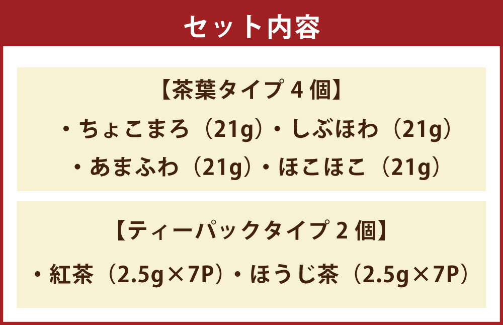 - 【ふるさと納税】7daysTEA 6個セット 茶葉タイプ×4個・ティーパックタイプ×2個 ちょこまろ・しぶほわ・あまふわ・ほこほこ 紅茶・ほうじ茶 緑茶 発酵茶 ほうじ茶 紅茶 お茶 飲料 箱詰め 農薬化学肥料不使用 ギフト 贈り物 贈答 国産 九州 熊本県 送料無料