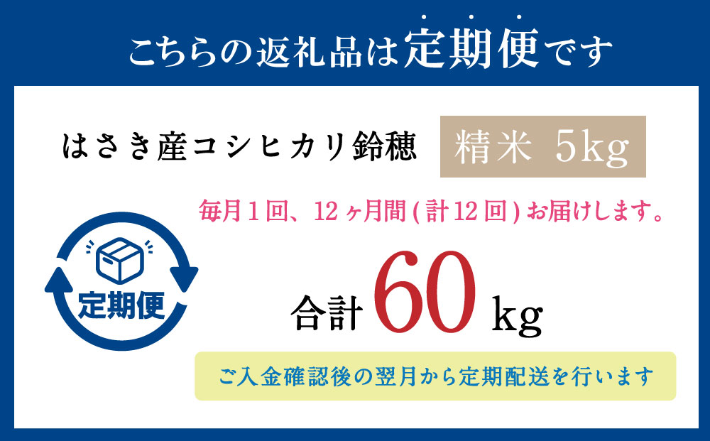 - 【ふるさと納税】【12ヶ月定期便】オリジナルブランド米!はさき産コシヒカリ 鈴穂 精米 5kg×12回 定期便 こしひかり 波崎産 もちもち 甘み 炊き立て 冷めても美味しい 国産 送料無料 茨城県 神栖市