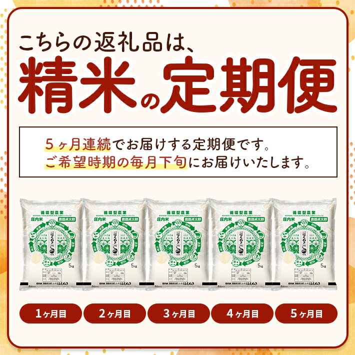 - 【ふるさと納税】≪5ヶ月定期便≫はえぬき 精米 5kg×5ヶ月連続 計25kg 令和7年産 山形県産 ご希望期間の毎月下旬にお届け 白米 庄内米 米 ごはん ご飯 酒田市 庄内 山形県 東北 定期便 5回