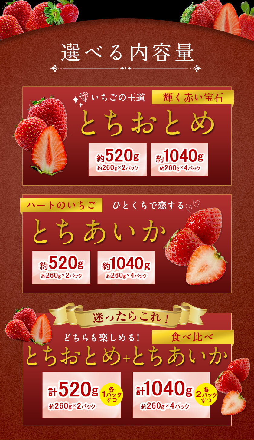 - 【ふるさと納税】 栃木 いちご 食べ比べ とちおとめ とちあいか 選べる 内容量 2パック 520g 4パック 1040g 《1月中旬-5月末頃出荷》 栃木県 野木町 いちご イチゴ 苺 とちおとめ とちあいか 食べ比べ 果物 フルーツ ハート型 ジューシー 【配送不可地域】沖縄・離島