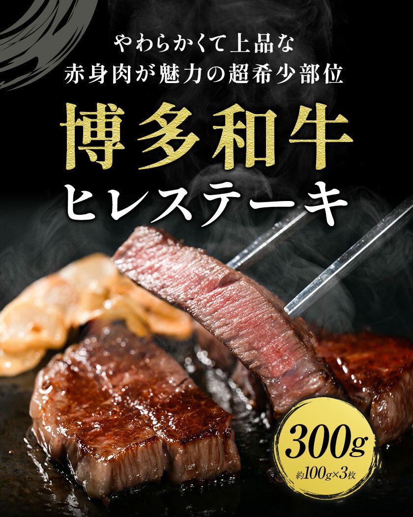 - 【ふるさと納税】牛肉 博多和牛 ヒレステーキ 300g 約100g × 3枚 株式会社エムケイ食品 【配送不可地域あり】《30日以内に出荷予定(土日祝除く)》 福岡県 鞍手町 和牛 国産 福岡県産 博多和牛 黒毛和牛 ヒレ肉 ヒレステーキ 厳選 ステーキ 300g
