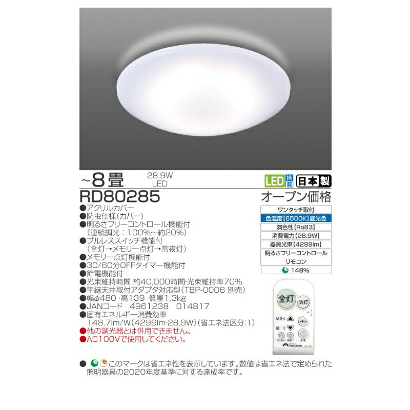 - 【ふるさと納税】【瀧住電機工業株式会社】~8畳用 調光 高効率 リモコンシーリングライト RD80285 リモコンスイッチ 日本製 照明 簡単 便利 ライト インテリア 天井 リビング 寝室 ダイニング キッチン 台所 TAKIZUMI 瀧住電機工業