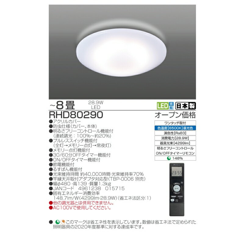 - 【ふるさと納税】【瀧住電機工業株式会社】~8畳用 調光 高効率 留守番タイマー付き リモコンシーリングライト RHD80290 留守番 タイマー 防犯 節電 リモコンスイッチ 日本製 照明 ライト インテリア 天井 リビング 寝室 ダイニング キッチン TAKIZUMI 瀧住電機工業