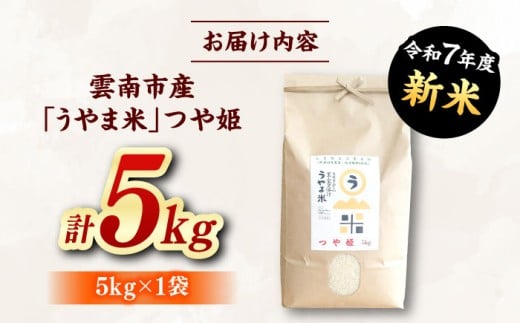 お米【新米】神話の里/吉田町「うやま米」つや姫 5kg(5kg×1) 白米 精米 コメ おこめ お米 つやひめ おすすめ 人気 米 ごはん ご飯 食卓 主食 ブランド米 お取り寄せ グルメ ご当地米 家族 ファミリー 一人暮らし 便利 5キロ おいしい ごはんソムリエ 種もみ ミネラル 国産 新生活 お弁当 朝ごはん 朝食 昼食 ご当地 島根県雲南市/有限会社藤本米穀店 [AIDB086]