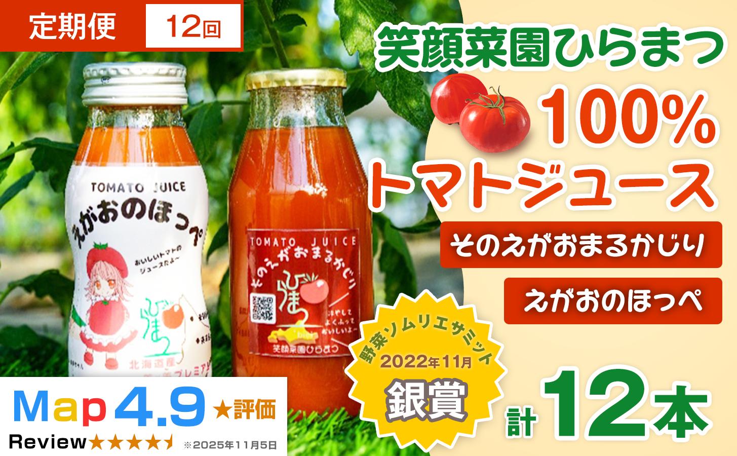 【定期便・全12回】毎日飲みたくなる大玉トマト100%ジュース そのえがおまるかじりとえがおのほっぺセット(各6本計12本)×12回| 新鮮野菜 旬の野菜 ヘルシー 健康 高糖度 大容量 リコピン ミネラル 健康 おやつ ギフト 贈り物 北海道 上川郡 [288-05]