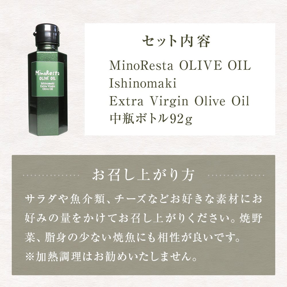 - MinoResta OLIVE OIL Ishinomaki Extra Vigin Olive Oil 中瓶ボトル オリーブオイル オリーブ オイル