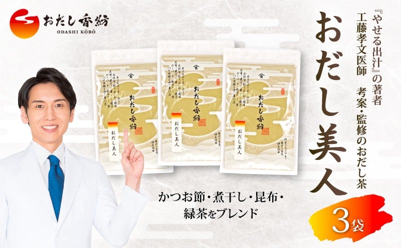 - 【出汁の王道】 おだし香紡 おだし美人 3袋セット 鰹節 昆布 緑茶 出汁 ダシ だし 調味料 健康 美容 ダイエット 減塩 工藤孝文先生監修 おだし茶 和食 食塩無添加 保存料無添加 酵母エキス無添加 うま味 無塩 国産 厳選素材 ギフト 料理 スープ 野菜 煮物 人気 太鼓判 話題 出汁専門店 三島市 静岡県
