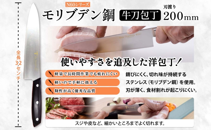 - N60シリーズ 牛刀 200mm ペティナイフ120mm 包丁 シェフナイフ ナイフ キッチン用品 調理器具 キッチングッズ 切れ味 錆びにくい モリブデン鋼 洋包丁 高品質 プロ仕様 耐久性 日本製 料理 プレゼント ギフト 贈り物 竹内刃物製作所 岐阜県 美濃市