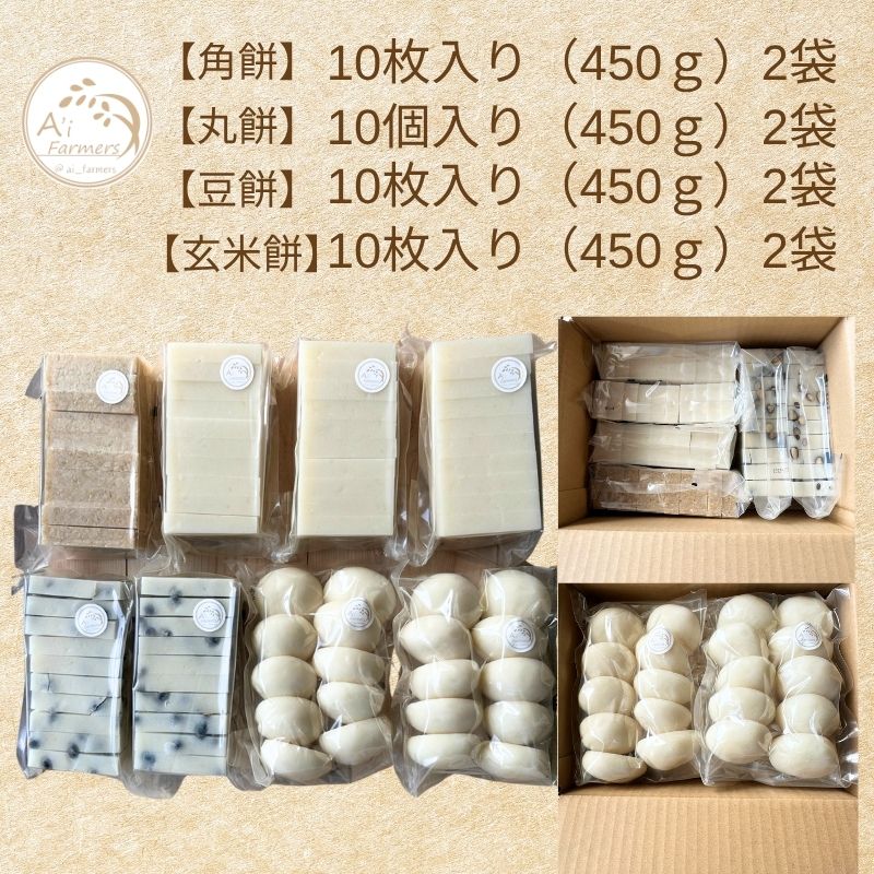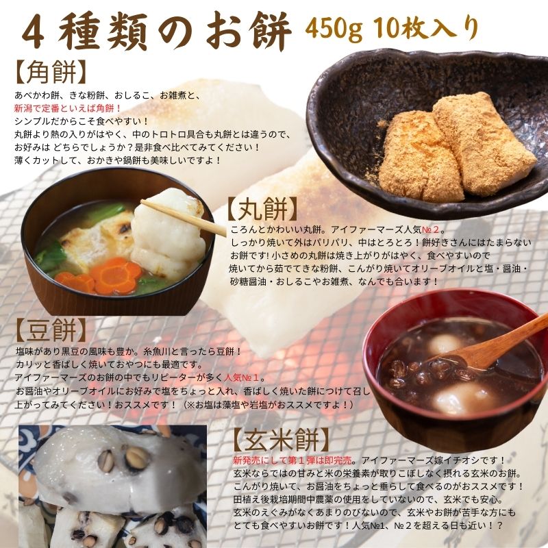 - 【ふるさと納税】新潟県産 こがねもち「杵つき餅」4種セット3.6kg 【12月25日入金分まで年内発送】白角餅2袋/白丸餅2袋/豆餅2袋/玄米餅2袋 各1袋10個入り(450g)×8袋 美味しい 糸魚川市 今井産 アイファーマーズ【鍋 お雑煮 焼餅 もち米 きな粉餅 お正月 もち 餅 モチ】