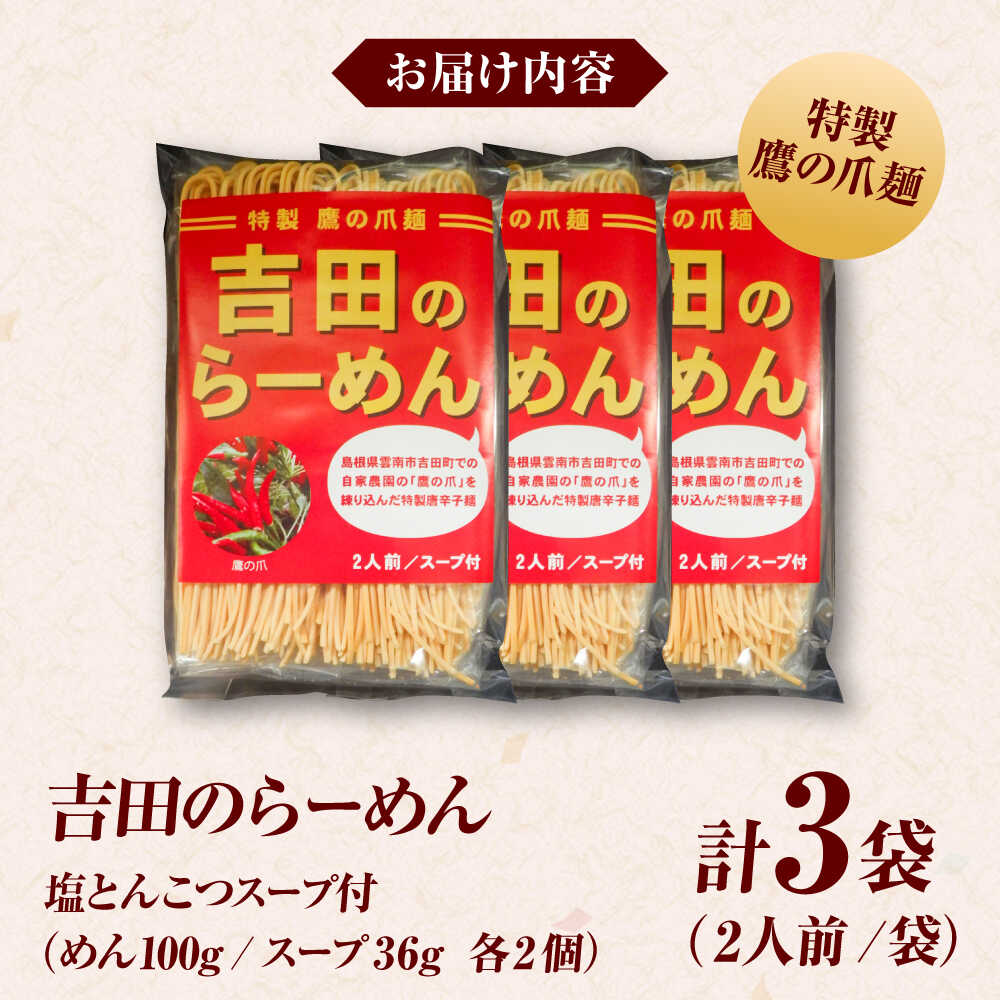 - 【ふるさと納税】ラーメン 吉田のらーめんスープ付(鷹の爪を練り込んだ自家製麺100g、スープ36g各2個)3袋入り ラーメン 自家製麺 旨辛 ピリ辛 スープ付き ラーメンキット 麺 めん 人気 おすすめ 中華 乾麺 唐辛子 とうがらし 島根県雲南市/有限会社田井産業[AICY004]