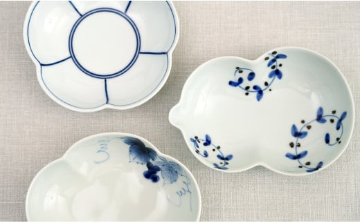 有田焼 文青 菊形小皿 3枚セット【まるぶんオリジナル】食器 器 うつわ 磁器 陶磁器 和食器 取皿 小皿 豆皿 菊 染付 赤絵 初期伊万里 お正月 ハレの日 赤 青 電子レンジ対応 A35-339