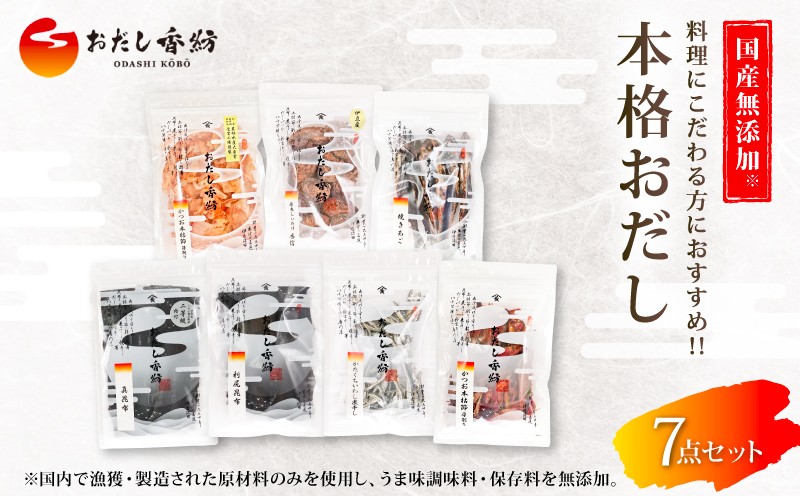 【出汁の王道】 おだし香紡 本格おだし 7点セット かつお節 鰹 削り節 あご いわし 煮干し 味噌汁 煮物 無塩 国産 本格だし 厳選素材 高級 ギフト プレゼント 贈り物 おすすめ 人気 ダシ 調味料 和食 食塩無添加 保存料無添加 酵母エキス無添加 和風だし ロングセラー 太鼓判 話題 出汁専門店 料理 静岡県 三島市