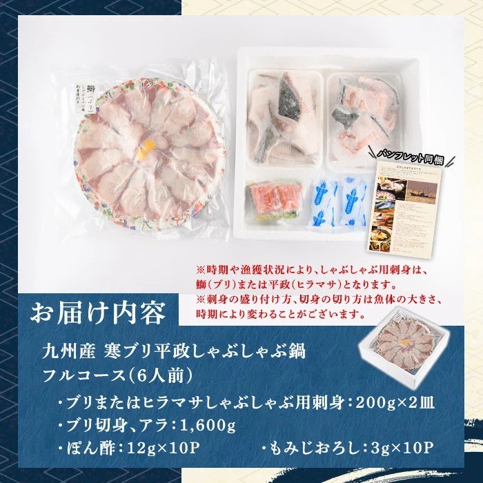 - 九州産 寒ブリ平政しゃぶしゃぶ鍋フルコース(6人前) ぶり ブリ 鰤 ぶりしゃぶ 鰤しゃぶ 寒鰤 ひらまさ ヒラマサ 魚介 海鮮 鍋 セット 刺身 さしみ 切り身 切身 アラ 食べ比べ 冷凍【マル五】as06-004