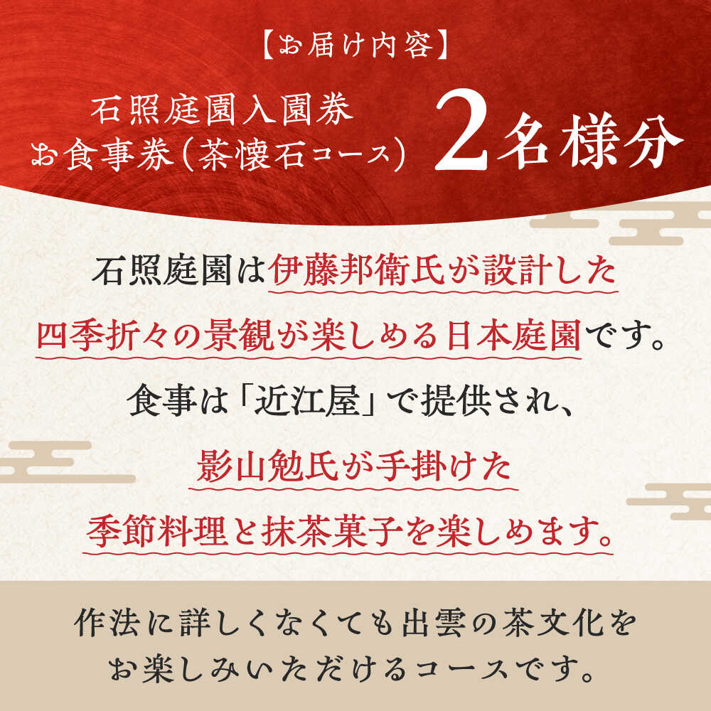 - 【ふるさと納税】 ペアチケット 回遊式日本庭園「石照庭園」茶懐石ペアチケット 体験 食事券 お食事券 ランチ ディナー 懐石料理 日本料理 2名様 2人分 お出かけ レジャー 観光 お取り寄せ 人気 おすすめ ギフト プレゼント 記念日 お祝い 島根県雲南市/石照庭園[AIAC003]