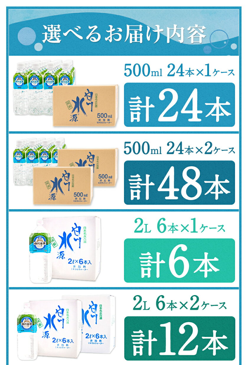 - 【ふるさと納税】日本名水百選ミネラルウォーター「南阿蘇・白川水源」選べる 500ml×24本入 2L×6本入 1ケース 2ケース 定期便 もあり 3ヶ月 6ヶ月 12ヶ月(計6回)《出荷時期をお選びください》熊本県 南阿蘇村 物産館自然庵 水 ミネラルウォーター