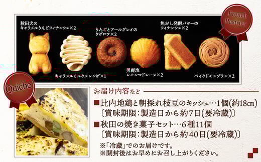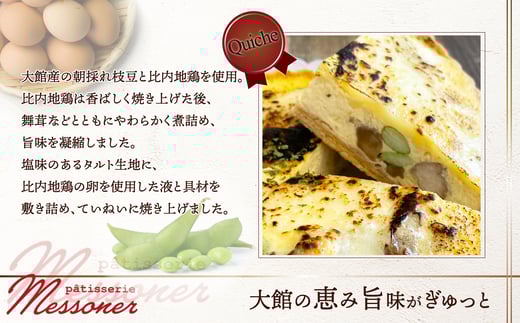 - 比内地鶏と枝豆のキッシュ&焼き菓子セット 145P5601 / 東北 秋田 大館 キッシュ おやつ ブランチ 軽食 比内地鶏 比内鶏 ひないどり ヒナイドリ 枝豆 男鹿 塩 菓子 お菓子 フィナンシェ キャラメル りんご リンゴ スイーツ デザート マドレーヌ ミルク メレンゲ アールグレイ クグロフ モンブラン