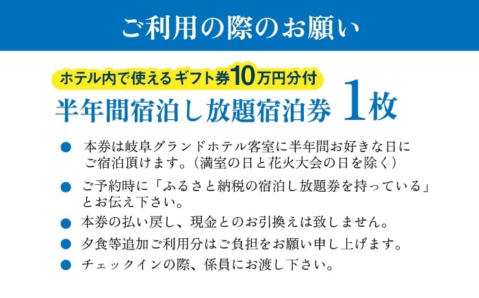 - 宿泊券 【岐阜グランドホテル】半年間宿泊し放題(10万円分ホテルギフト券付) ホテル チケット 定期便 ペア ワーケーション 長期滞在 温泉 大浴場 朝食付き ビュッフェ 金華山 長良川 観光 旅行 宿泊 ホテル スイートルーム ロイヤルスイートルーム 和室 贅沢 セレブ 商品券 おすすめ 人気 フレンチ 中華 和食 岐阜市 / 岐阜グランドホテル [ANFM014]