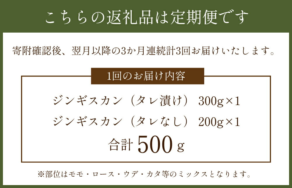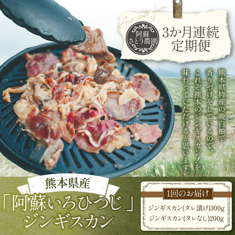 - 【ふるさと納税】【3か月連続定期便】熊本県産 「阿蘇いろひつじ」 ジンギスカン 1回あたり計500g(タレ漬け:300g・タレなし:200g) 計1.5kg(500g×3回) 1ヶ月毎 3回 国産羊 羊肉 お肉 惣菜 醤油ベース しょうゆ 冷凍 熊本県産 国産 九州 熊本県 送料無料