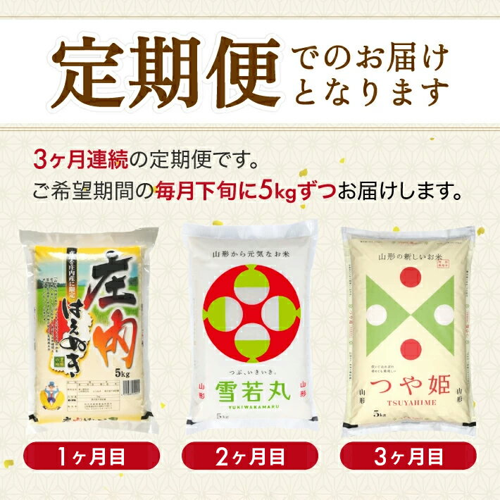 - 【ふるさと納税】≪3ヶ月定期便≫ 庄内米3銘柄食べ比べ 5kg×3ヶ月連続 はえぬき 雪若丸 つや姫 計15kg 山形県庄内産 ご希望期間の毎月下旬頃お届け 東北 酒田市 お米 精米 白米 ブランド米 セット 味比べ 小分け