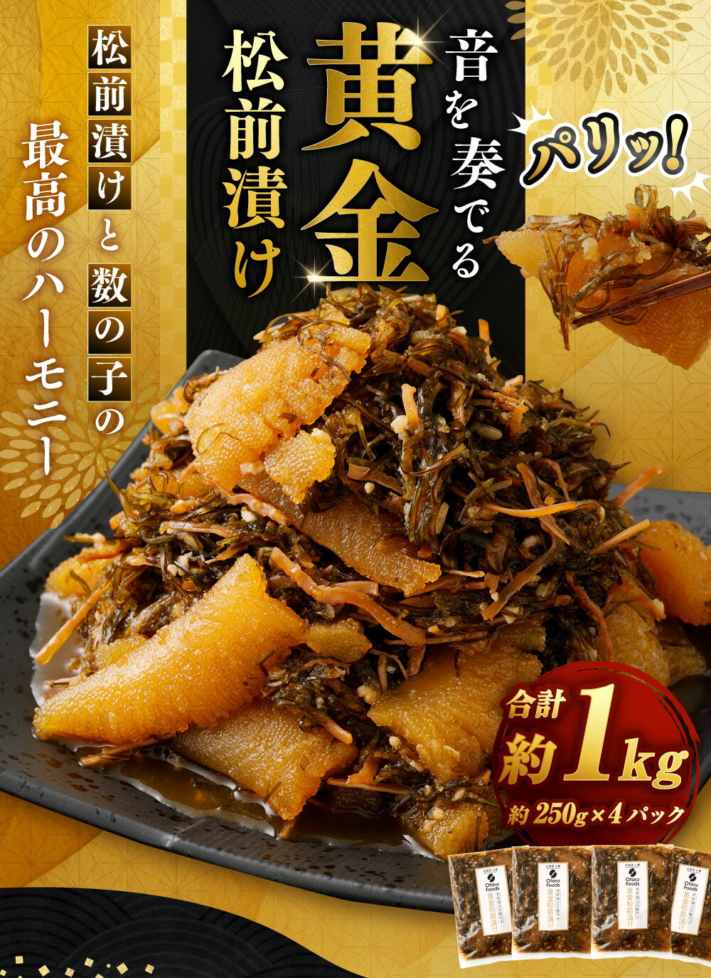 - 【ふるさと納税】音を奏でる 黄金松前漬け 250g×4パック (計1kg) 松前漬 漬物 つけもの お漬物 昆布 こんぶ スルメイカ 米麹 あご出汁 数の子 前菜 晩酌 箸休め ご飯のお供 ごはん 白ご飯 ギフト 贈り物 おすすめ お取り寄せ 食品 グルメ 冷凍 小樽市 北海道 送料無料