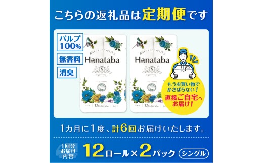 - 定期便 全6回 Hanataba トイレットペーパー シングル 2パック(1パック12ロール) パルプ100% フェアリーエンボス加工 消臭 無地 無香料 緑茶成分配合 日用品 生活用品 消耗品 防災 備蓄 毎月発送 富士市 [sf002-502]