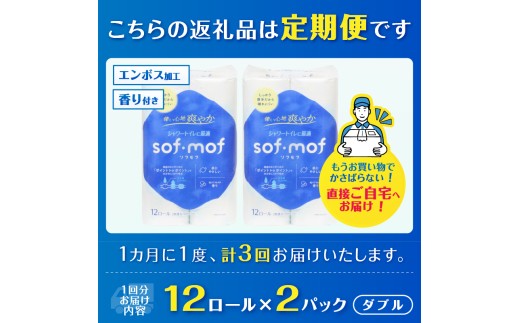 - 定期便 トイレットペーパー ソフモフ ダブル 3回 2パック (1パック12R) 石けんの香り シャワートイレ用 エンボス加工 パルプ100% バラ柄 厚手 生活用品 日用品 消耗品 防災 備蓄 毎月発送 富士市 [sf002-494]