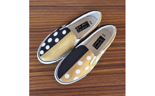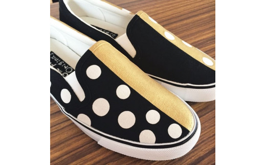 - 手描きスニーカー「bell」26.5cm ゴールド×ブラック 水玉柄【受注制作】