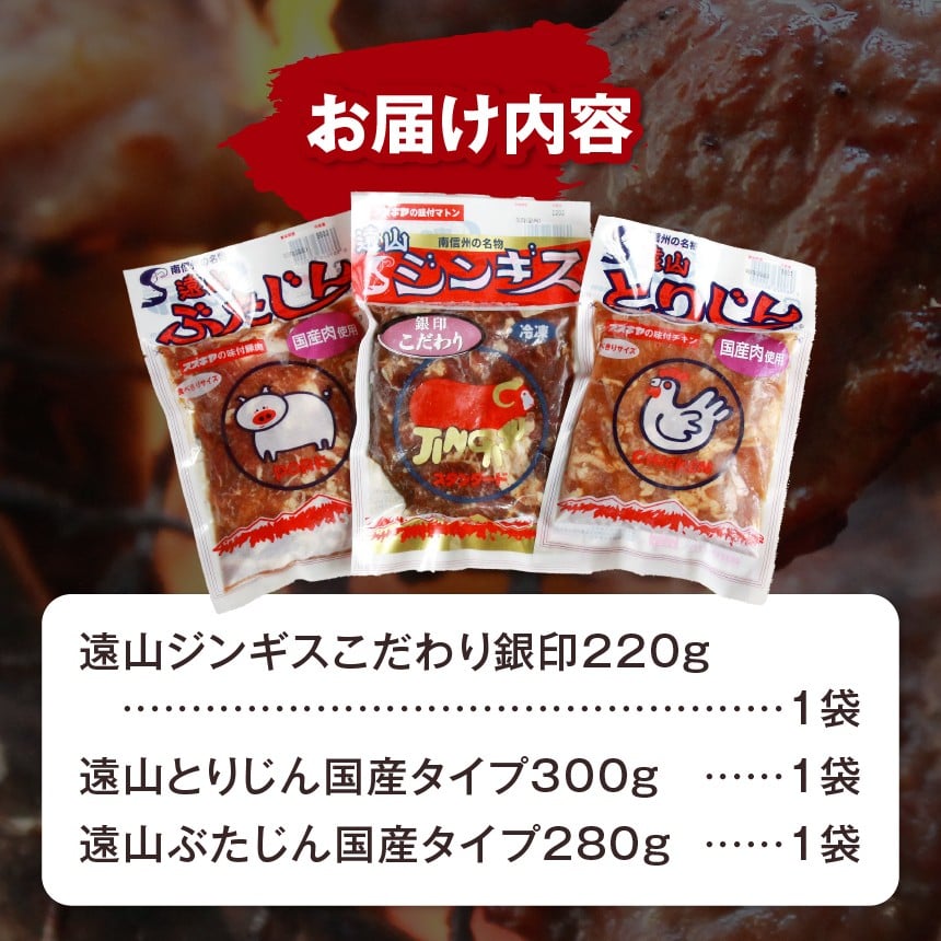 - 遠山 ジンギス 人気 3点 セット | ジビエ 肉 にく ジンギス 羊 鶏 鳥 豚 味付 味付け肉 簡単 便利 焼肉 炒め物 惣菜 おかず おつまみ セット 食べ比べ 冷凍 長野県 飯田市 信州