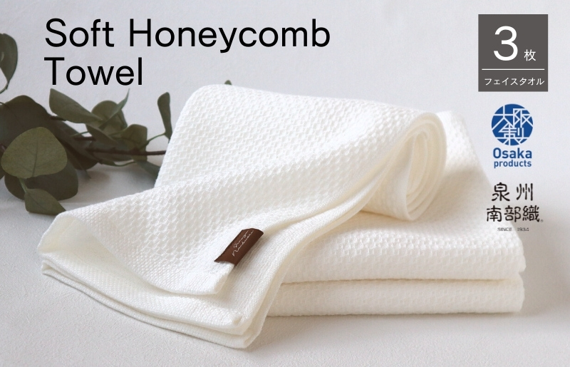 - G1908 【ソフトハニカム】泉州南部織 フェイスタオル3枚セット(ホワイト)+ソフトハニカム織ハーフハンカチ1枚