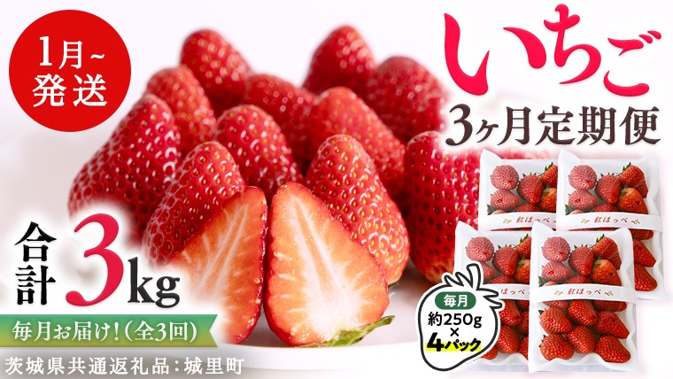 【 定期便 】 合計3kgお届け いちご の3ヶ月連続お届け便 (1回:250g×4パック)×3回 【2026年1月から発送開始】(茨城県共通返礼品:城里町) 果物 フルーツ イチゴ 苺 白いちご 白苺 とちおとめ 白いちご 紅ほっぺ やよいひめ 定期便 [BI346-NT]