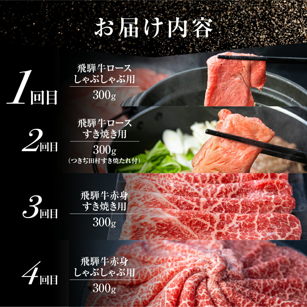 - 【ふるさと納税】飛騨牛すきしゃぶ定期便 4回 肉 定期便 たれ付 飛騨牛 5等級 しゃぶしゃぶ すき焼き 食べ比べ ウデモモ ロース お楽しみ定期便 4ヵ月 国産牛 国産 牛肉 肉 厳選 熟成 肉の沖村 飛騨市 10万円 100,000円 [Q2673] 定期便 どやな飛騨市