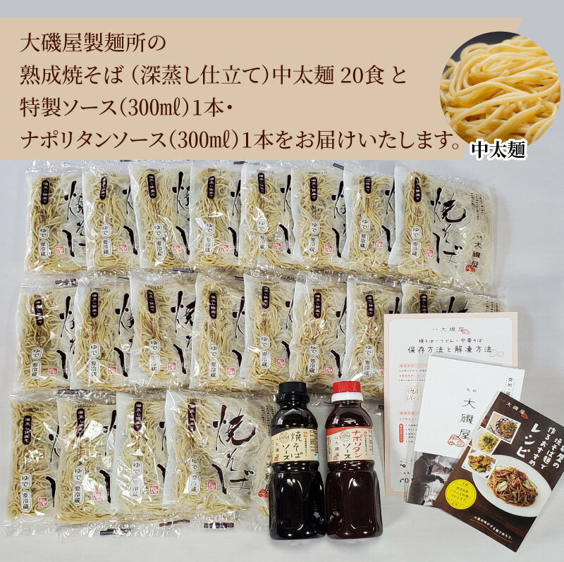 - 【ふるさと納税】メディア紹介多数!大磯屋製麺所の熟成焼そば(深蒸し仕立て) 20食(中太麺) 特製ソース1本・ナポリタンソース1本付き