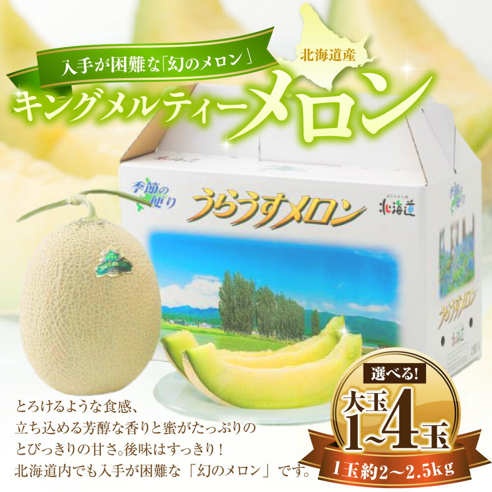 【ふるさと納税】〈選べる容量〉キングメルティー メロン 大玉1玉 (約2kg~2.5kg) / 大玉 4玉 (1玉約2kg) くだもの 果物 果実 フルーツ メロン 青肉 希少 デザート 贈答 ギフト プレゼント 北海道 浦臼町 送料無料 【2026年7月上旬~2026年7月下旬発送予定】